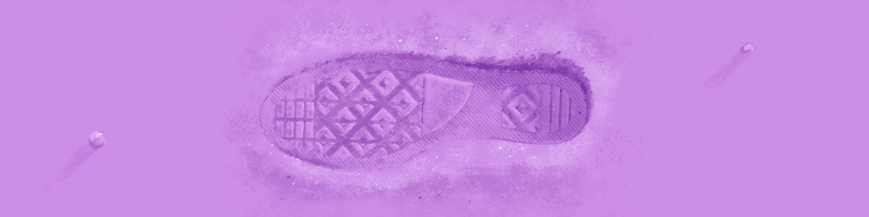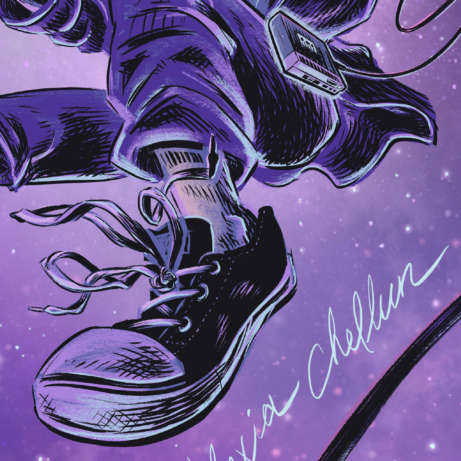 Alexia had done a promotional photoshoot with a blazer and sneakers and suggested that outfit could be used for the illustration. In homage to the steps on the moon, I depicted the footprint of a vintage sneaker for the back cover.