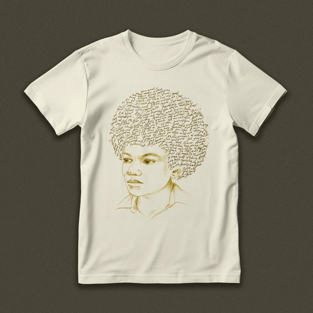 I chose to handwrite lyrics from various songs in Michael’s career as if it were a diary entry—a more personal reflection of his heart and mind. He sang about healing our world, so I chose a sepia looking ink for a natural tone and a tan, recycled cotton material for the shirt (also adding to the effect of aged paper).